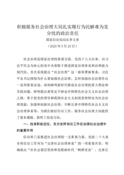 / 署名文章:20250523积极服务社会治理大局扎实履行为民解难为党分忧的政治责任——国家信访局局长李文章