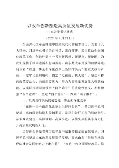 署名文章:20250421以改革创新塑造高质量发展新优势——山东省委书记林武