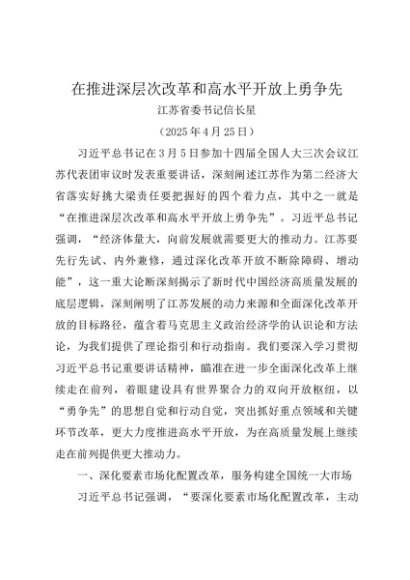 / 署名文章:20250425在推进深层次改革和高水平开放上勇争先——江苏省委书记信长星