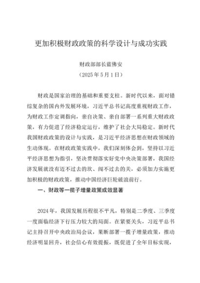 署名文章:20250501更加积极财政政策的科学设计与成功实践——财政部部长蓝佛安