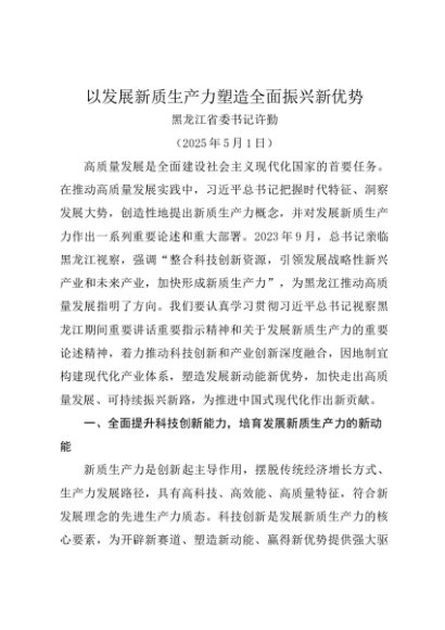 署名文章:20250501以发展新质生产力塑造全面振兴新优势——黑龙江省委书记许勤