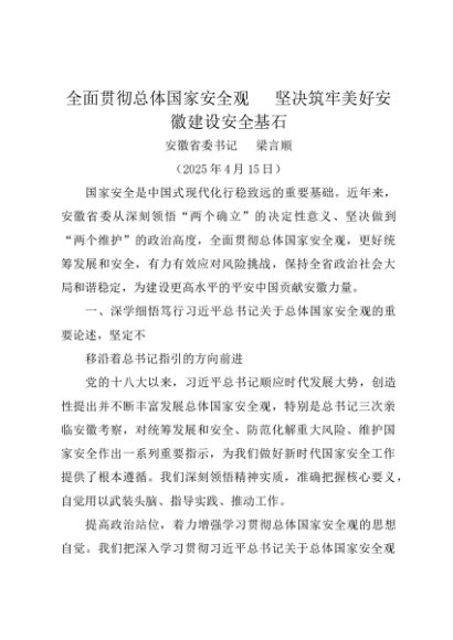 署名文章:20250415全面贯彻总体国家安全观 坚决筑牢美好安徽建设安全基石——安徽省委书记 梁言顺