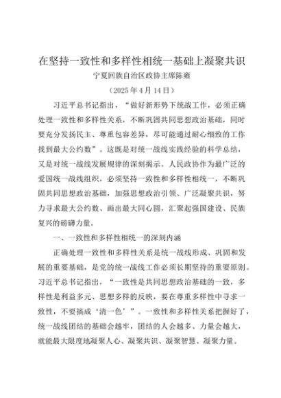 署名文章:20250414在坚持一致性和多样性相统一基础上凝聚共识——宁夏回族自治区政协主席陈雍