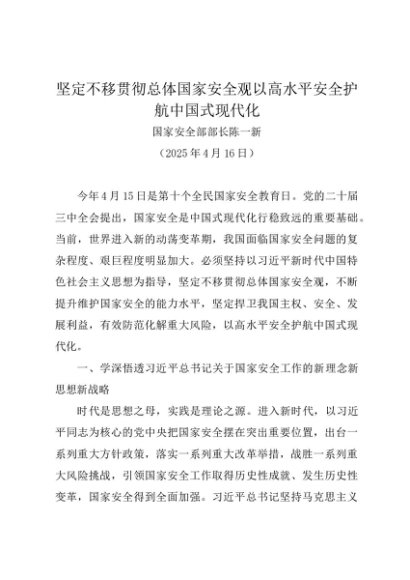 署名文章:20250416坚定不移贯彻总体国家安全观以高水平安全护航中国式现代化——国家安全部部长陈一新