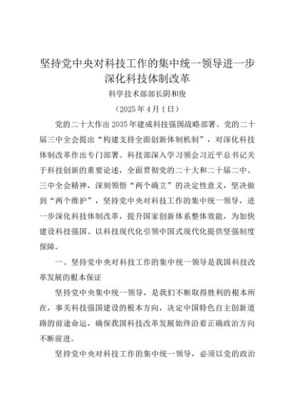 署名文章:20250401坚持党中央对科技工作的集中统一领导进一步深化科技体制改革——科学技术部部长阴和俊