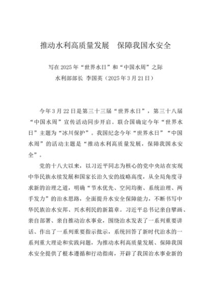 署名文章:20250321推动水利高质量发展 保障我国水安全.写在2025年“世界水日”和“中国水周”之际——水利部部长 李国英