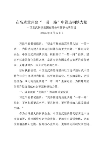 / 署名文章:20250327在高质量共建“一带一路”中锻造钢铁力量——中国宝武钢铁集团有限公司董事长胡望明