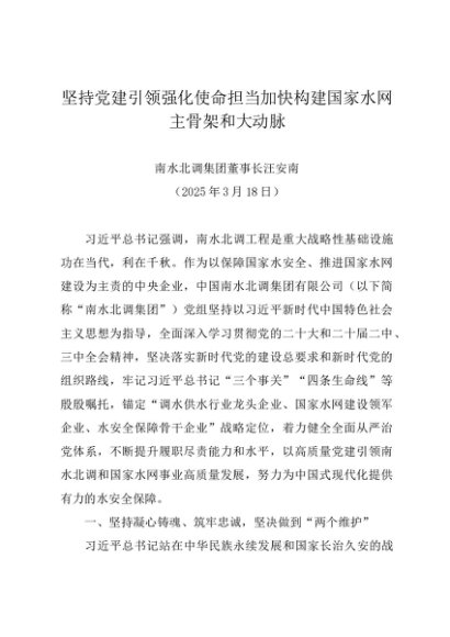 / 署名文章:20250318坚持党建引领强化使命担当加快构建国家水网主骨架和大动脉——南水北调集团董事长汪安南