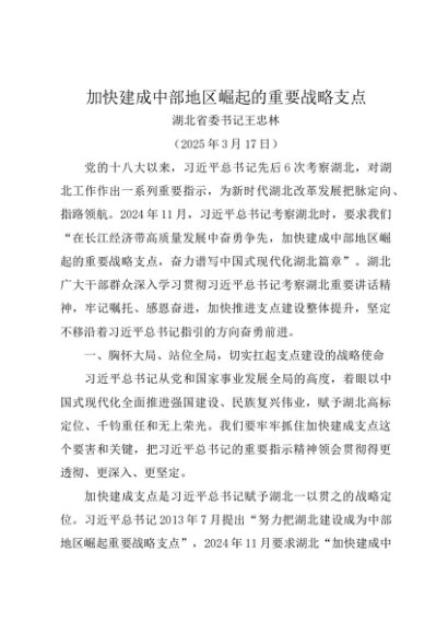 署名文章:20250317加快建成中部地区崛起的重要战略支点——湖北省委书记王忠林