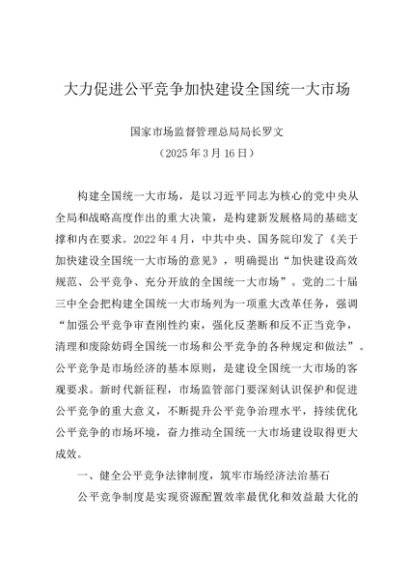 / 署名文章:20250316大力促进公平竞争加快建设全国统一大市场——国家市场监督管理总局局长罗文