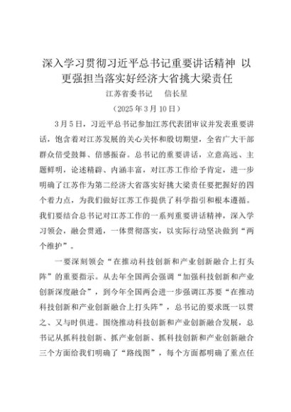 署名文章:20250310深入学习贯彻习近平总书记重要讲话精神 以更强担当落实好经济大省挑大梁责任——江苏省委书记 信长星