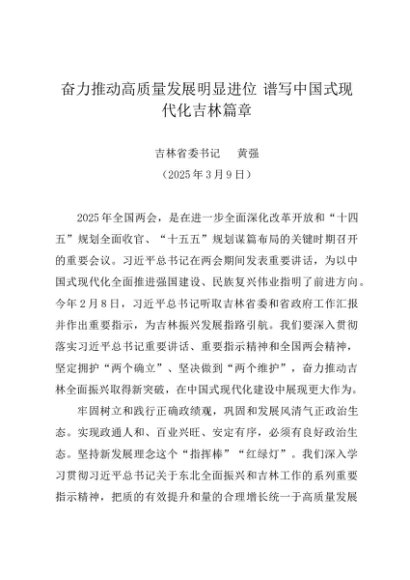 / 署名文章:20250309奋力推动高质量发展明显进位 谱写中国式现代化吉林篇章——吉林省委书记 黄强