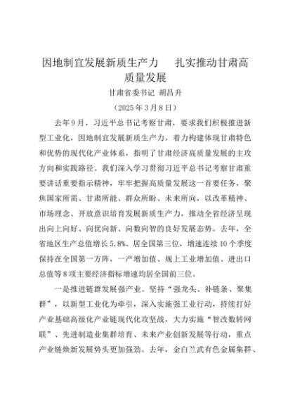 署名文章:20250308因地制宜发展新质生产力 扎实推动甘肃高质量发展——甘肃省委书记 胡昌升