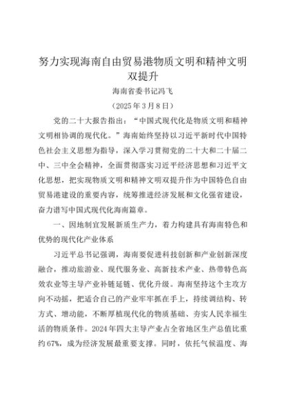 / 署名文章:20250308努力实现海南自由贸易港物质文明和精神文明双提升——海南省委书记冯飞