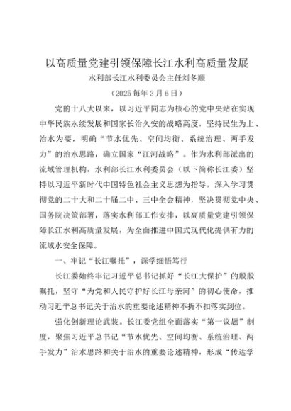 / 署名文章:20250306以高质量党建引领保障长江水利高质量发展——水利部长江水利委员会主任刘冬顺
