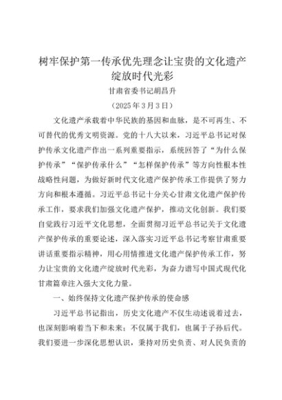 署名文章:20250303树牢保护第一传承优先理念让宝贵的文化遗产绽放时代光彩——甘肃省委书记胡昌升