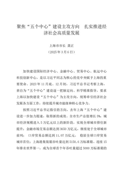 / 署名文章:20250306聚焦“五个中心”建设主攻方向 扎实推进经济社会高质量发展——上海市市长 龚正