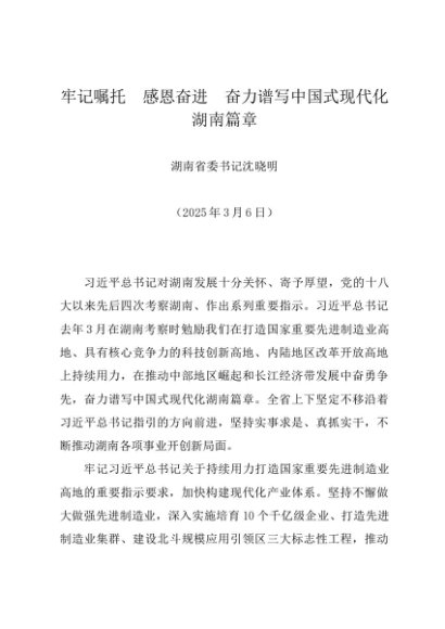 署名文章:20250306牢记嘱托 感恩奋进 奋力谱写中国式现代化湖南篇章——湖南省委书记沈晓明