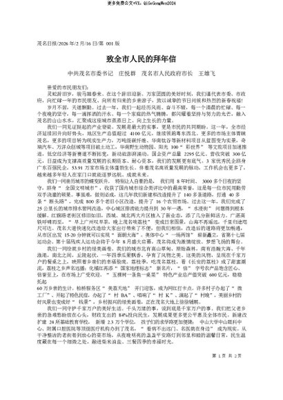 / 署名文章:20260228致全市人民的拜年信_中共茂名市委书记__庄悦群...名市人民政府市长__王雄飞