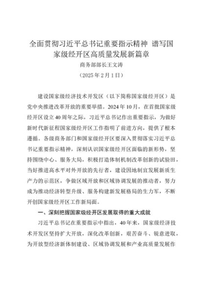 / 署名文章:20250201全面贯彻习近平总书记重要指示精神 谱写国家级经开区高质量发展新篇章——商务部部长王文涛
