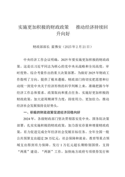 署名文章:20250221实施更加积极的财政政策 推动经济持续回升向好——财政部部长 蓝佛安