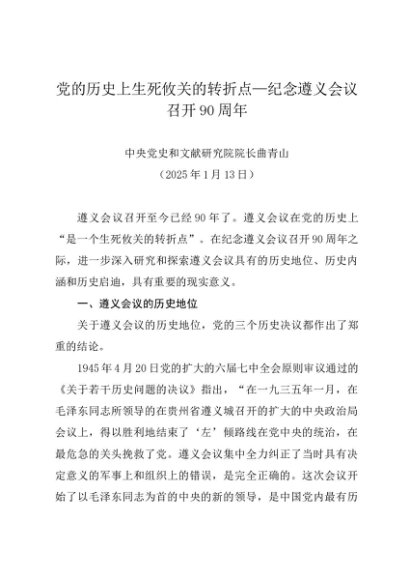 / 署名文章:20250113党的历史上生死攸关的转折点—纪念遵义会议召开90周年——中央党史和文献研究院院长曲青山