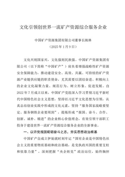 署名文章:20250109文化引领创世界一流矿产资源综合服务企业——中国矿产资源集团有限公司董事长姚林