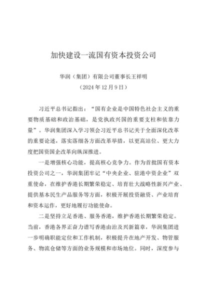 / 署名文章:20241209加快建设一流国有资本投资公司——华润(集团)有限公司董事长王祥明