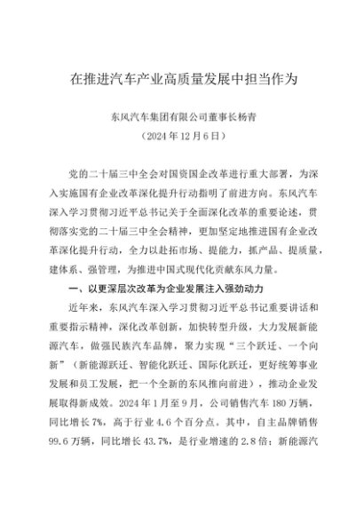 / 署名文章:20241206在推进汽车产业高质量发展中担当作为——东风汽车集团有限公司董事长杨青