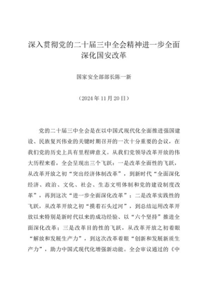署名文章:20241120深入贯彻党的二十届三中全会精神进一步全面深化国安改革——国家安全部部长陈一新