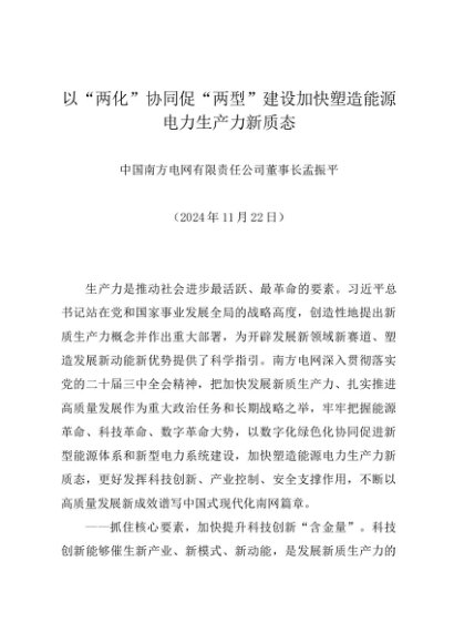 署名文章:20241122以“两化”协同促“两型”建设加快塑造能源电力生产力新质态——中国南方电网有限责任公司董事长孟振平