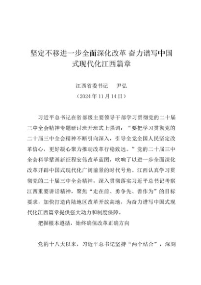 署名文章:20241104坚定不移进一步全面深化改革 奋力谱写中国式现代化江西篇章——江西省委书记 尹弘