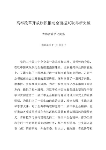 署名文章:20241118高举改革开放旗帜推动全面振兴取得新突破——吉林省委书记黄强