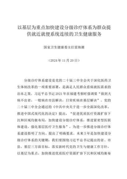署名文章:20241120以基层为重点加快建设分级诊疗体系为群众提供就近就便系统连续的卫生健康服务——国家卫生健康委主任雷海潮