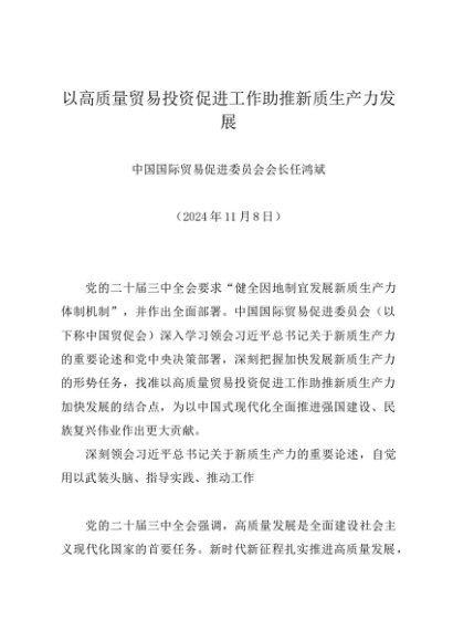 署名文章:20241108以高质量贸易投资促进工作助推新质生产力发展——中国国际贸易促进委员会会长任鸿斌