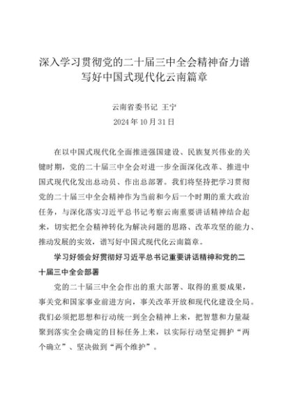 署名文章:20241031深入学习贯彻党的二十届三中全会精神奋力谱写好中国式现代化云南篇章——云南省委书记 王宁