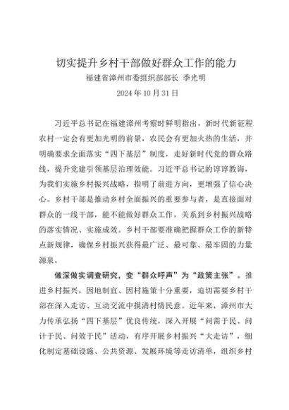 署名文章:20241031切实提升乡村干部做好群众工作的能力——福建省漳州市委组织部部长 季光明