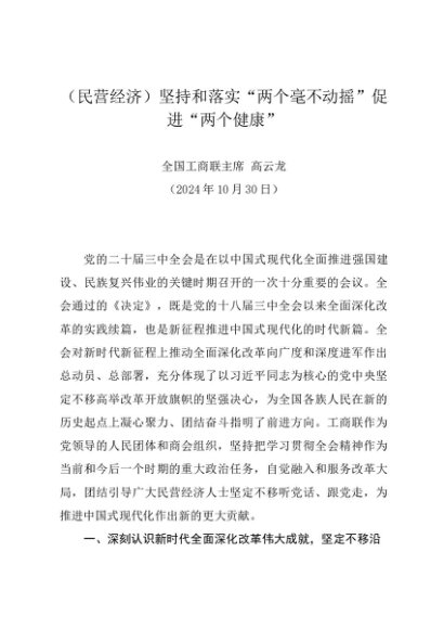 署名文章:20241030(民营经济)坚持和落实“两个毫不动摇”促进“两个健康”——全国工商联主席 高云龙