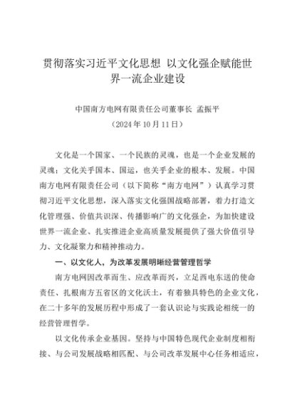 / 署名文章:20241011贯彻落实习近平文化思想 以文化强企赋能世界一流企业建设——中国南方电网董事长 孟振平
