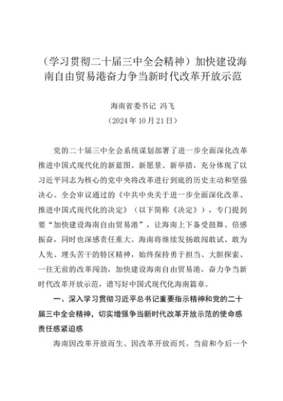 署名文章:20241021(学习贯彻二十届三中全会精神)加快建设海南自由贸易港奋力争当新时代改革开放示范——海南省委书记 冯飞