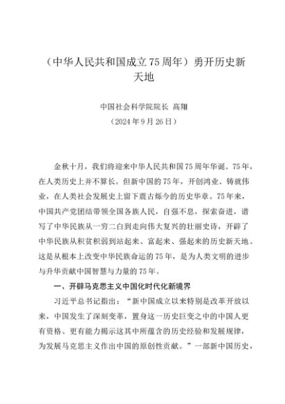 署名文章:20240926(中华人民共和国成立75周年)勇开历史新天地——中国社会科学院院长 高翔