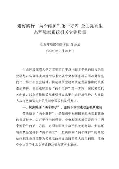 署名文章:20240926走好践行“两个维护”第一方阵 全面提高生态环境部系统机关党建质量——生态环境部党组书记 孙金龙
