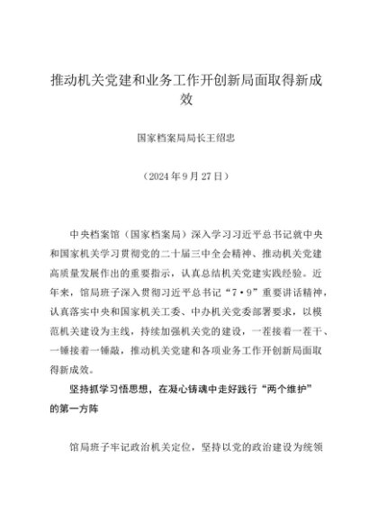 署名文章:20240927推动机关党建和业务工作开创新局面取得新成效——国家档案局局长王绍忠