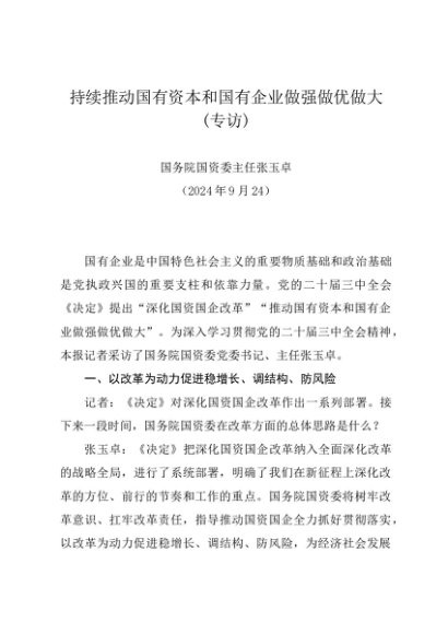 / 署名文章:20240924持续推动国有资本和国有企业做强做优做大(专访)——国务院国资委主任张玉卓