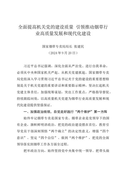 / 署名文章:20240920全面提高机关党的建设质量 引领推动烟草行业高质量发展和现代化建设——国家烟草专卖局局长 张建民