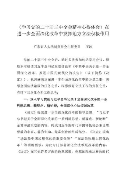 署名文章:20240918(学习贯彻三中全会精神)在进一步全面深化改革中发挥地方立法积极作用——广东省人大法制委员会主任委员 王波