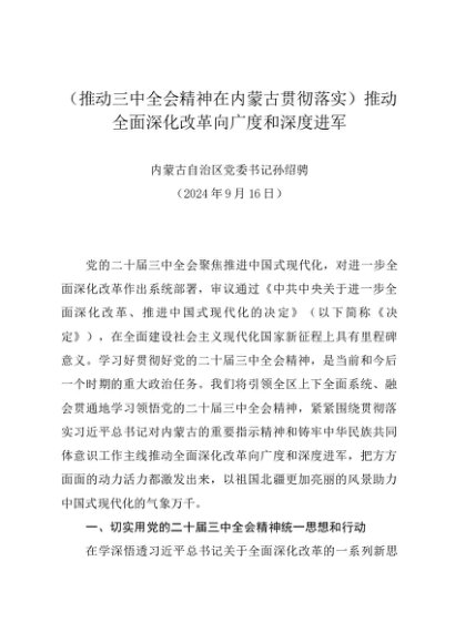 署名文章:20240916(推动三中全会精神在内蒙古贯彻落实)推动全面深化改革向广度和深度进军——内蒙古自治区党委书记孙绍骋
