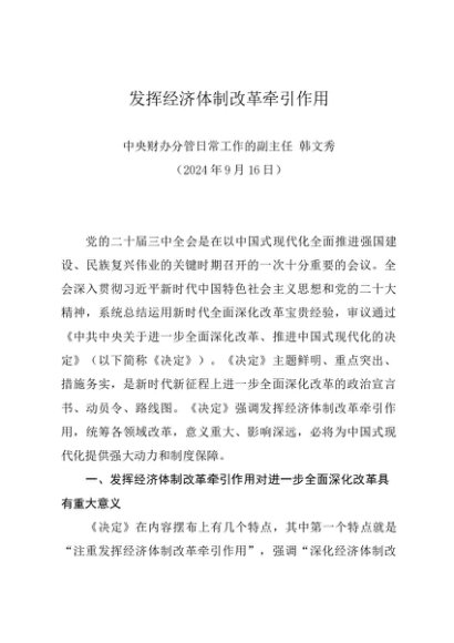 署名文章:20240916发挥经济体制改革牵引作用——中央财办分管日常工作的副主任 韩文秀