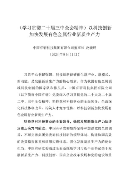 署名文章:20240911(学习贯彻二十届三中全会精神)以科技创新加快发展有色金属行业新质生产力——中国有研科技集团董事长 赵晓晨