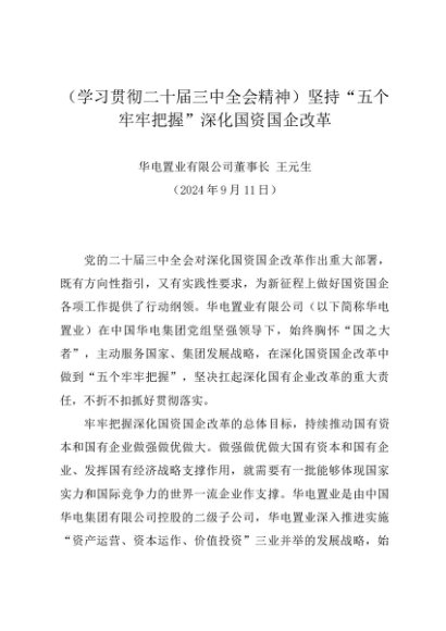 署名文章:20240911(学习贯彻二十届三中全会精神)坚持“五个牢牢把握”深化国资国企改革——华电置业有限公司董事长 王元生